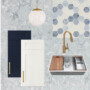 To complete the look, we incorporated the Minka Langford pendant light, which adds softness and a touch of warmth overhead while tying in beautifully with the champagne bronze finishes. Paired with a subtle blue-and-white hex tile backsplash, the overall design gains texture and personality without overwhelming the space.