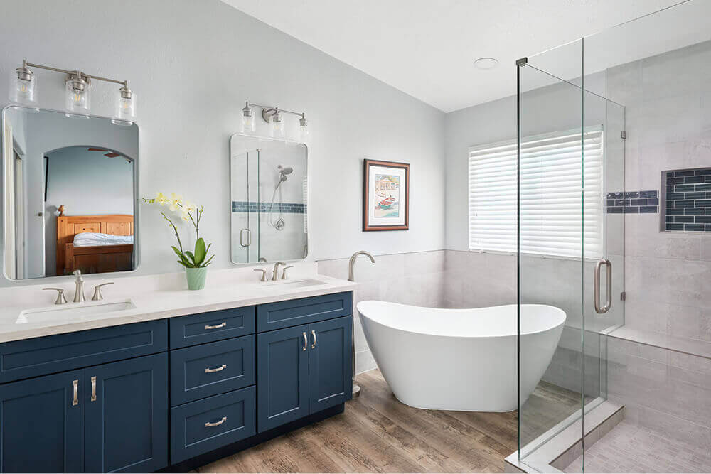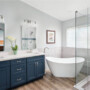 To unify the home’s aesthetic, the design team carried the deep navy tones from the kitchen into the bathroom. The vanity was finished in a striking dark blue, complemented by a decorative tile stripe in the shower that echoes the same rich hues. A freestanding tub was carefully selected to balance form and function—large enough for lounging but scaled to fit seamlessly within the space. Brushed nickel fixtures, clean-lined mirrors, and a crisp countertop added a touch of modern elegance.