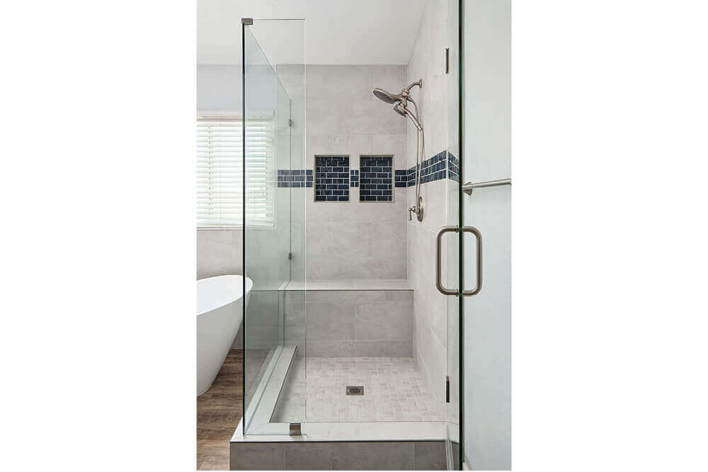 The remodel transformed the bathroom into a serene yet bold retreat. The glass-enclosed shower features oversized wall tiles with navy mosaic accents and convenient niches for storage. The vanity provides ample counter and storage space while serving as a statement piece. The freestanding tub now serves as the heart of the room—a spa-like feature that meets the family’s love for baths. While focusing on the bathroom, the homeowners also asked for a closet refresh. Lenton Company designed a new layout with built-ins that thoughtfully accommodated the homeowners’ wardrobes, maximizing function and organization. The customized closet design gave the couple a practical and stylish upgrade that matched the care given to the bathroom. The result is a pair of spaces that are not only highly functional but also infused with personality and comfort.