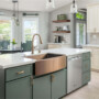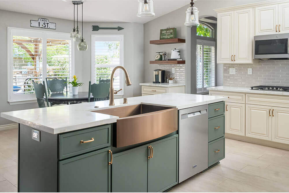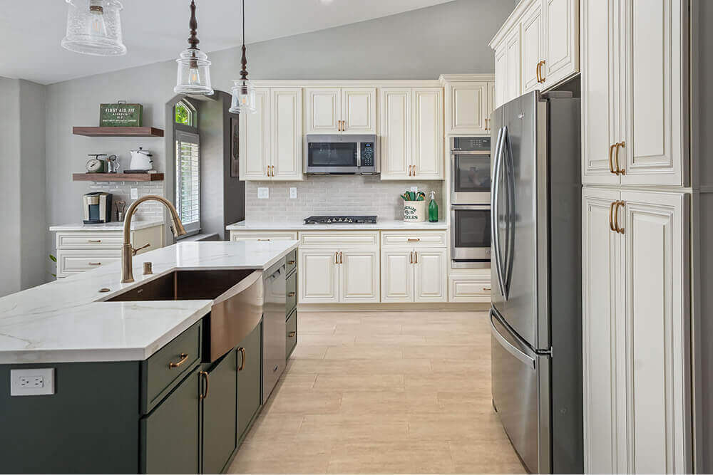In collaboration with the client, we developed a design that honored her love of antiques while introducing a modern layout to meet her family’s needs. To stay within budget, we selected a ready-to-assemble (RTA) cabinet line that offered the right combination of colors, door styles, and quality. Antique white perimeter cabinets set a timeless backdrop, while a sage green island added both prep space and a soft, inviting color contrast. Bronze finishes tied the elements together, blending warmth and elegance. The palette and finishes provided a gentle nod to her antique collection while creating a soothing, updated space.