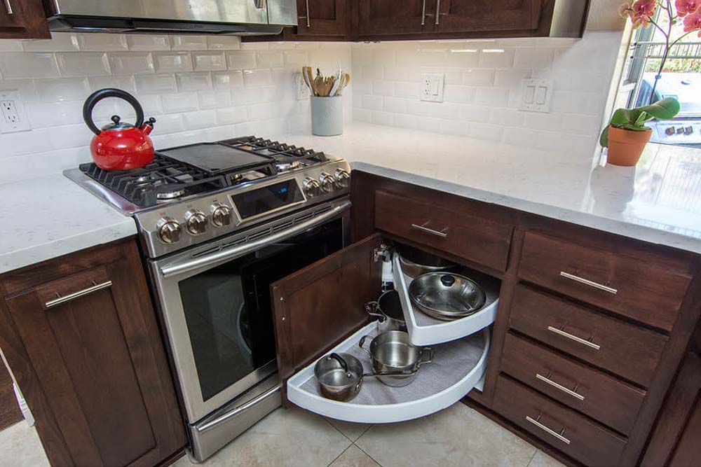 The solution focused on maximizing every inch without expanding beyond the existing footprint. By relocating the refrigerator into the recessed step-in pantry area, we created a built-in look while eliminating the obstruction to the dining room. A pull-out pantry cabinet was added alongside the refrigerator, improving storage and accessibility. The former refrigerator wall was reimagined with expanded countertop space that was perfect for small appliances and daily use. We extended cabinetry into the underutilized breakfast nook area using custom, shallow-depth cabinets with glass uppers making this addition feel intentional and seamlessly integrated into the home’s architecture. The U-shaped kitchen was reworked with added drawers and a half-moon lazy Susan, dramatically improving functionality. Removing the soffit allowed cabinetry to extend to the ceiling, creating a cleaner, more finished look.